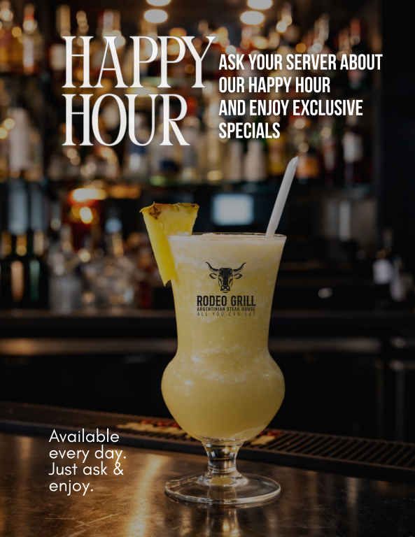 Ask your server about our Happy Hour specials and discover exclusive offers designed to make every visit even more enjoyable. Whether you’re stopping by after work or meeting friends for a relaxed evening, Rodeo Grill is the perfect place to sip, unwind, and stay a little longer.