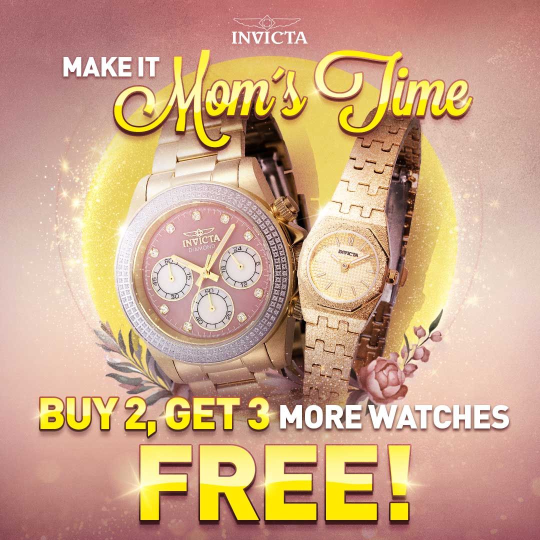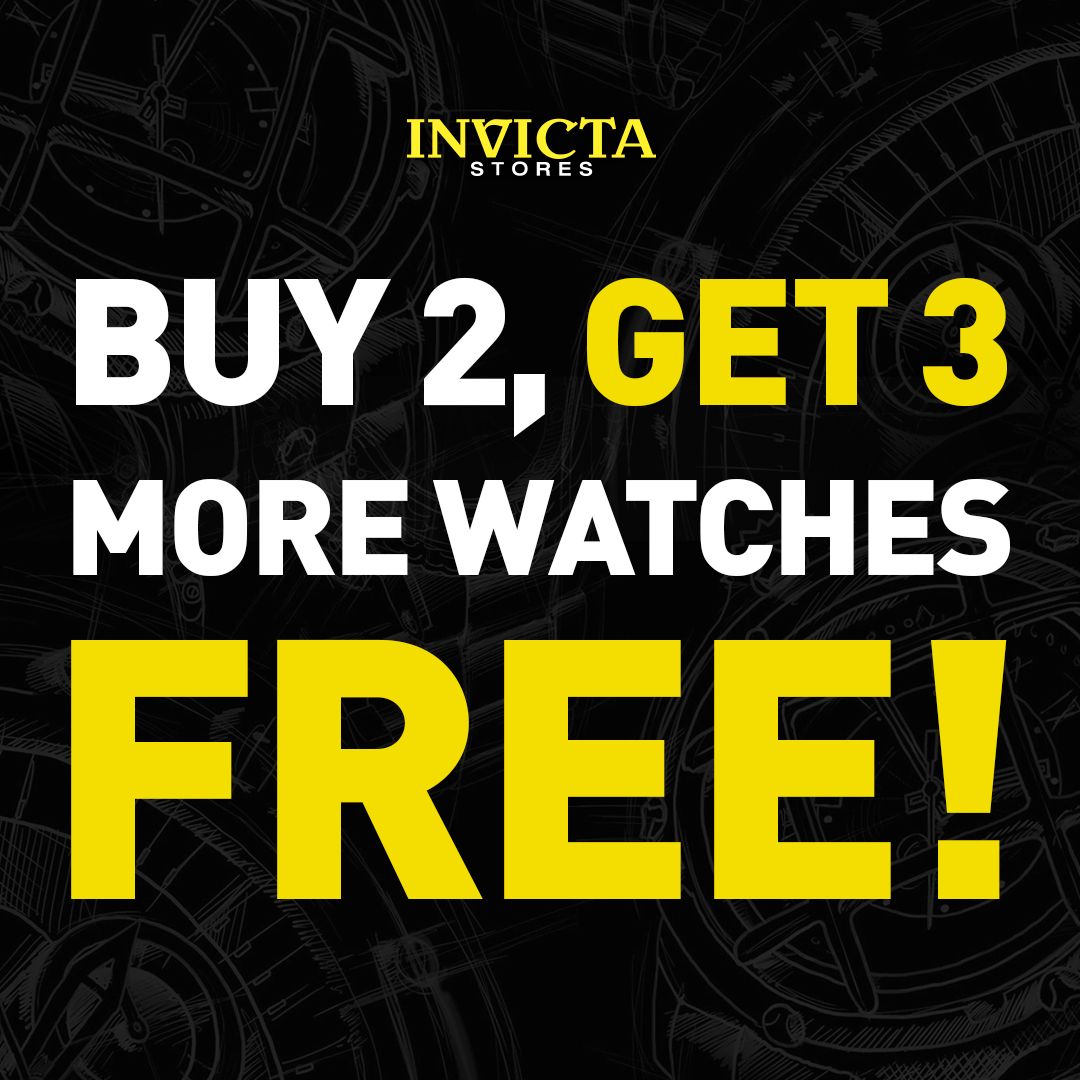 Visit Invicta Stores and take advantage of this incredible Buy 2, Get 3 More FREE offer. Discover bold designs, exceptional quality, and unbeatable value on your favorite timepieces. Ask an associate for details!